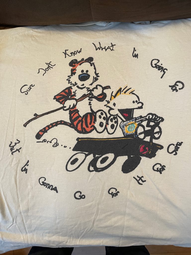 Since this essay is centered on autobiography, I’ll disclose here that I myself once bought a Dead shirt with yet another Calvin and Hobbes allusion – and weirdly, yet another quote from “Saint of Circumstance” – this one reading “Sure don’t know what I’m going for, but I’m gonna go for it for sure” featuring Calvin and Hobbes tearing down a hill in their little wagon…
